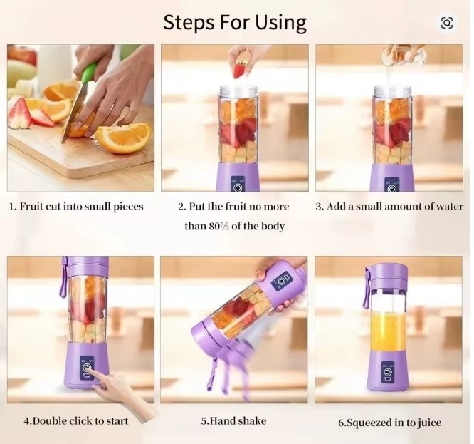 Portable Mini Juicer Blender is a powerful and compact device designed for fresh juices, smoothies, and shakes anytime, anywhere. It comes with a USB rechargeable battery, sharp stainless steel blades, and a leak-proof design. Perfect for gym, travel, office, and home use. Just add fruits, press the button, and enjoy healthy drinks instantly.